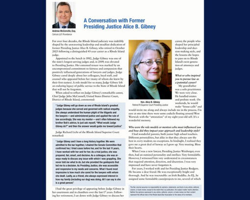 Partner Andrew McConville authored an article in the March/April edition of the Rhode Island Bar Journal titled, “A Conversation with Former Presiding Justice Alice B. Gibney”, highlighting Judge Gibney’s reflections, insights, and perspectives drawn from her distinguished judicial career.